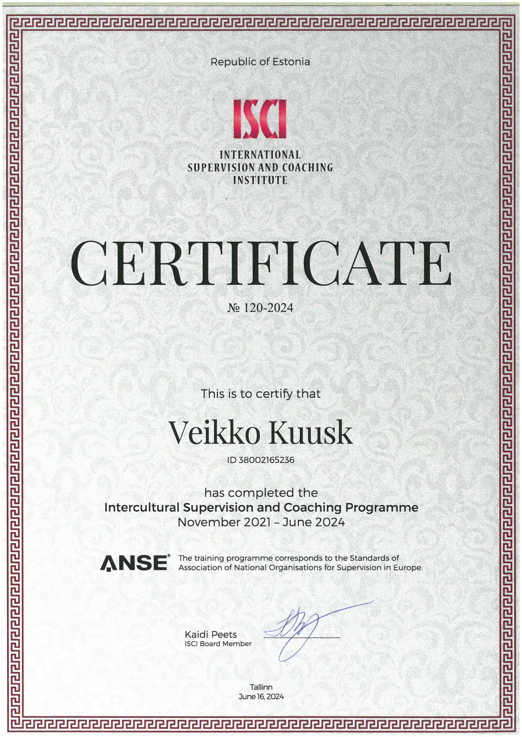 Tunned, et on keeruline olla? Segadus, pingelised suhted, suuna puudumine või juhina raskused tiimi ja töökaaslastega? Minu töö on aidata need umbsõlmed lahti harutada.Olen superviisor-coach ja endine pikaaegne tootmisjuht. Aitan inimestel leida endas rohkem selgust, teha mõtestatumaid otsuseid ning luua paremaid suhteid.Kasutan nii klassikalisi eesmärgi saavutamisele suunatud meetodeid kui ka loovaid ja sügavamaid kihte avavaid tööriistu. Mulle on omane detailide märkamine, otsekohesus, seoste nägemine ja turvalise ruumi hoidmine.Isiklikus elus meeldib mulle väga kokata, huvitun moodsast tehnoloogiast ning inimesest ja tema toimimisest.Superviisor-coachi sertifikaadi olen omandanud ISCI-s (International Supervision and Coaching Institut) 2,5-aastases väljaõppes. Olen ESCÜ (Eesti Supervisiooni ja Coachingu Ühing) liige.